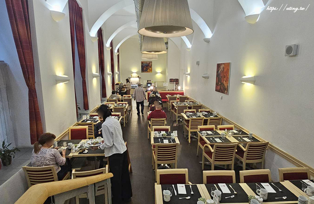 這次我們因布拉格一大早出門一開始沒有訂早餐,我站遠處往下拍,早餐屬於簡易式西式早餐。