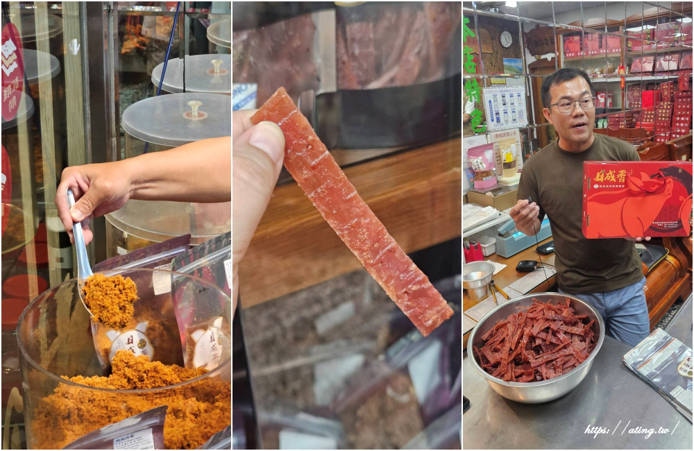 老闆熱情讓我們試吃肉鬆和肉乾:粗肉鬆粒粒分明、大人最愛,細肉鬆柔順輕盈,小朋友也能入口;肉乾口味多樣,古早味、黑胡椒、檸檬、辣味各有特色。